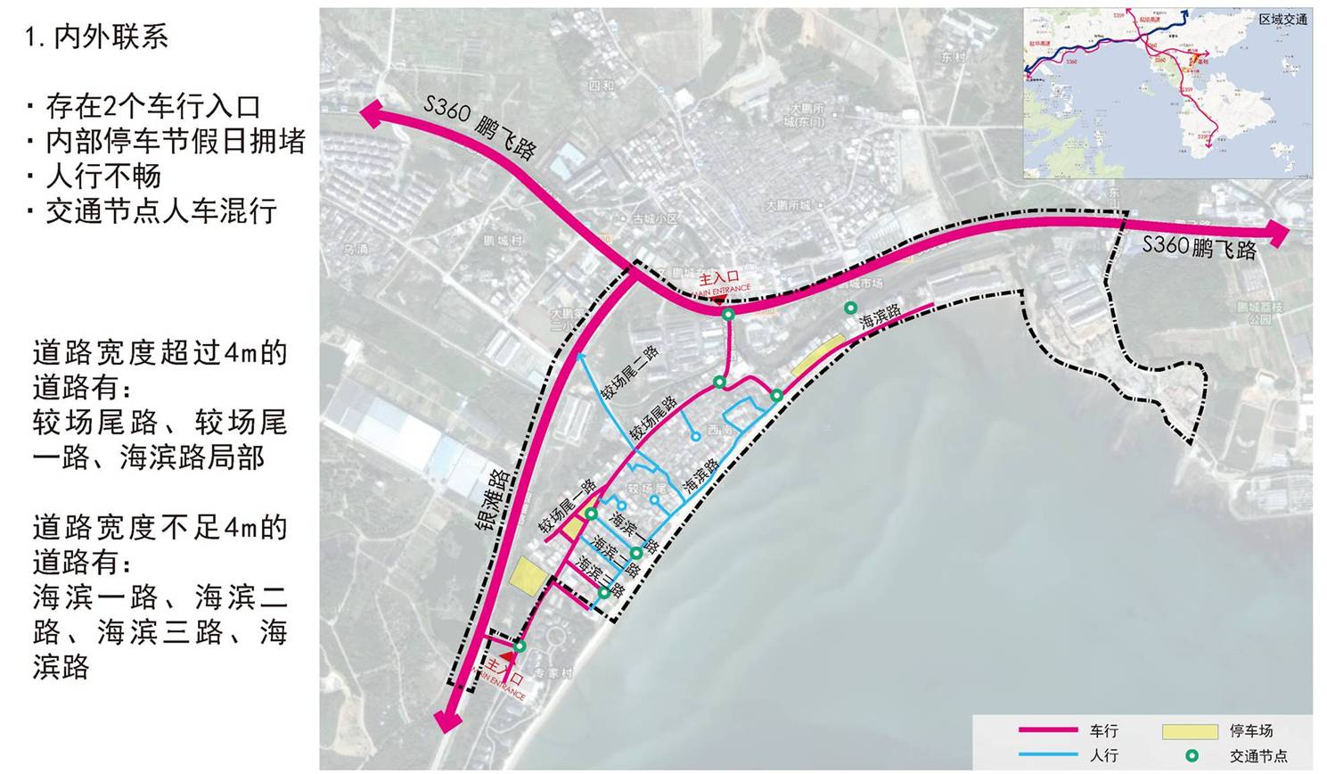 道路规划系统不完善:道路宽度不够、等级不均且不能构成体系完整的游线,道路系统只能满足对外联系;