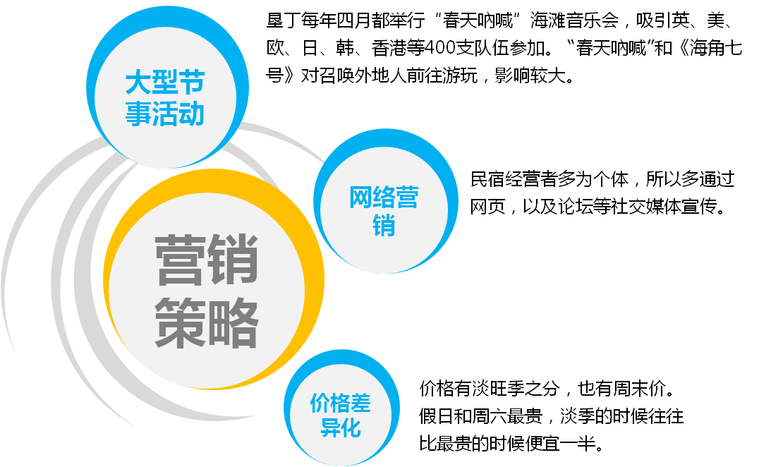 Ø 客房氛围营造:大多为观海景为卖点的客房,近80栋民宿由精心的设计而各有主题,各有特色作为各自卖点,主人为游客营造不同的滨海浪漫风情、实现游客梦想中的面朝大海的追求和享受。