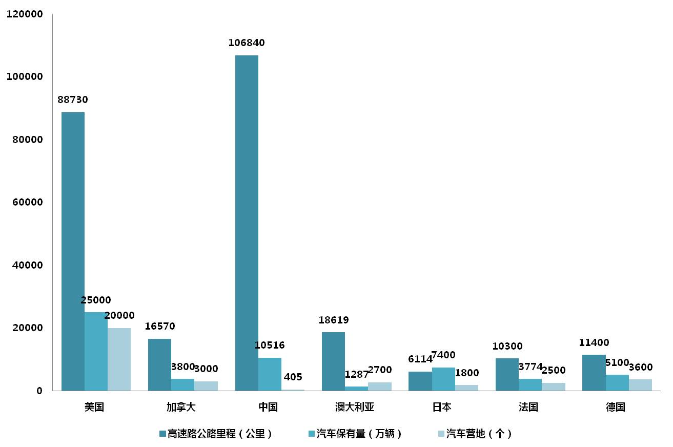 当前美国汽车营地数量与保有量的比值为1:12500,与高速公路里程比值为1:4.4;日本分别为1:4800、1:3.4;而国内目前汽车营地数与保有量的比值为1:250000,与高速公路里程比值为1:263000,远远不能满足同等汽车数量下自驾游需求。